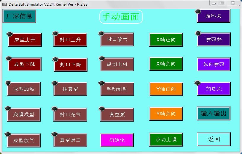 拉伸膜真空包裝機(jī)【手動畫面】主要用于機(jī)器的手動操作,有【廠家信息】【輸入輸出】兩個切換畫面,有【加熱開】【噴碼開】【擋料開】三個開關(guān)鍵和一個【初始化】按鍵。還有【成型上升】【成型下降】等二十個點(diǎn)動觸摸鍵。如下圖: